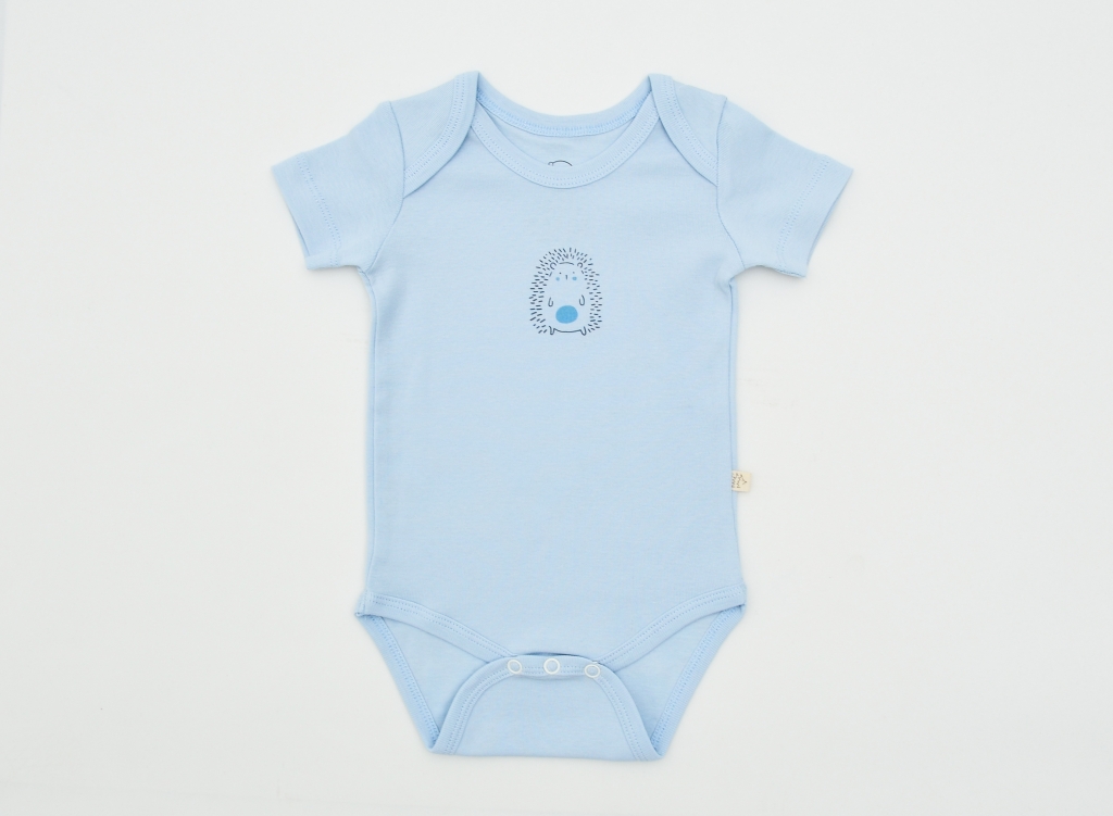 Kısa Kollu, Bisiklet Yaka ve Alt Kısmı Çıtçıt Kapama Detaylı Mavi Kumaş Üzerine Kirpi Baskı Desenli Likralı Süprem Pamuklu Erkek Bebek Body