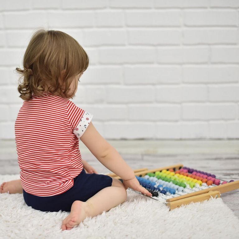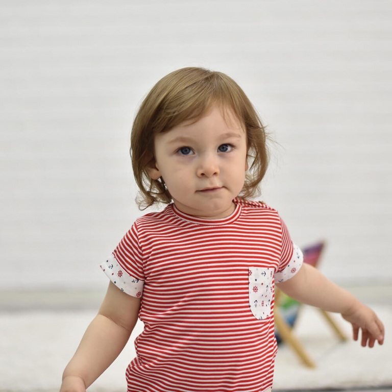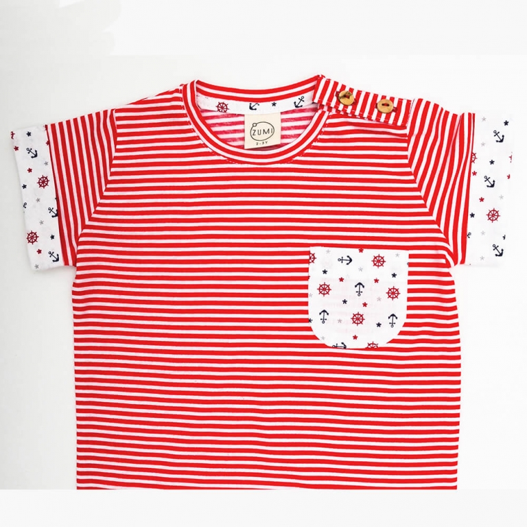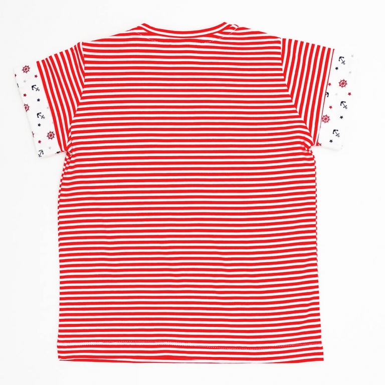 Erkek çocuk kırmızı beyaz çizgili, çapa desen cep ve kol detaylı likralı süprem t-shirt