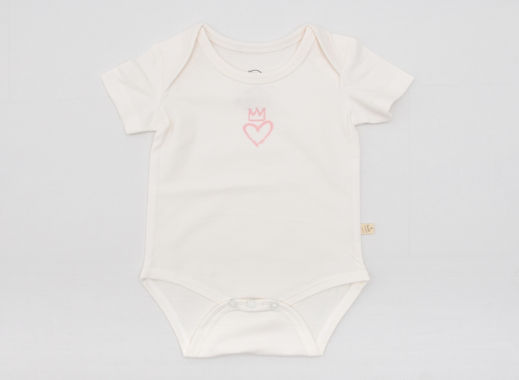| Kısa Kollu, Bisiklet Yaka ve Alt Kısmı Çıtçıt Kapama Detaylı Krem Kumaş Üzerine Kalp ve Taç Baskılı Likralı Süprem Pamuklu Kız Bebek Body |