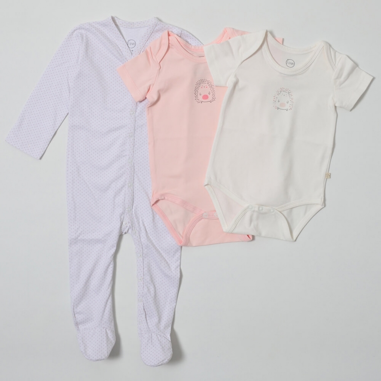 Kısa Kollu , Bisiklet Yaka ve Alt Kısmı Çıtçıt Kapama Detaylı Pembe Kumaş Üzerine Gri Kirpi Baskı Desenli Likralı Süprem Pamuklu Kız Bebek Body