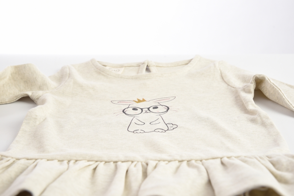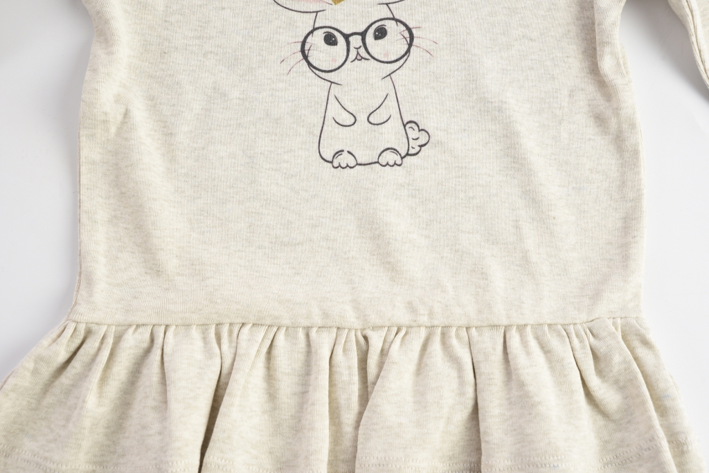 Uzun kollu, bej renk organik boya tavşan desenli , etek kısmı fırfırlı , likralı süprem pamuklu kumaş sweatshirt