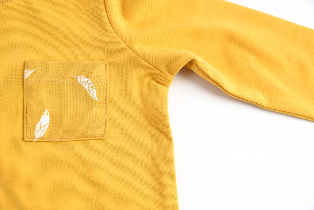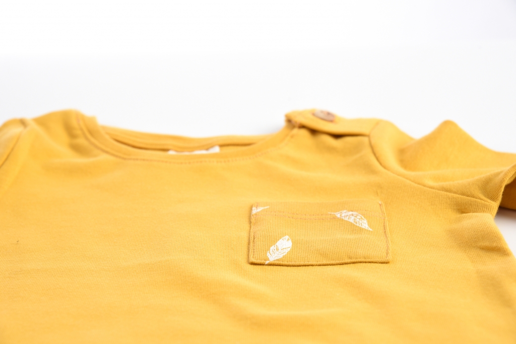 Uzun kollu, Bisiklet yaka, Sarı renk göğüs cebi tüy desen baskılı, Omuzdan ahşap düğmeli, Likralı süprem pamuklu kumaş Erkek çocuk sweatshirt